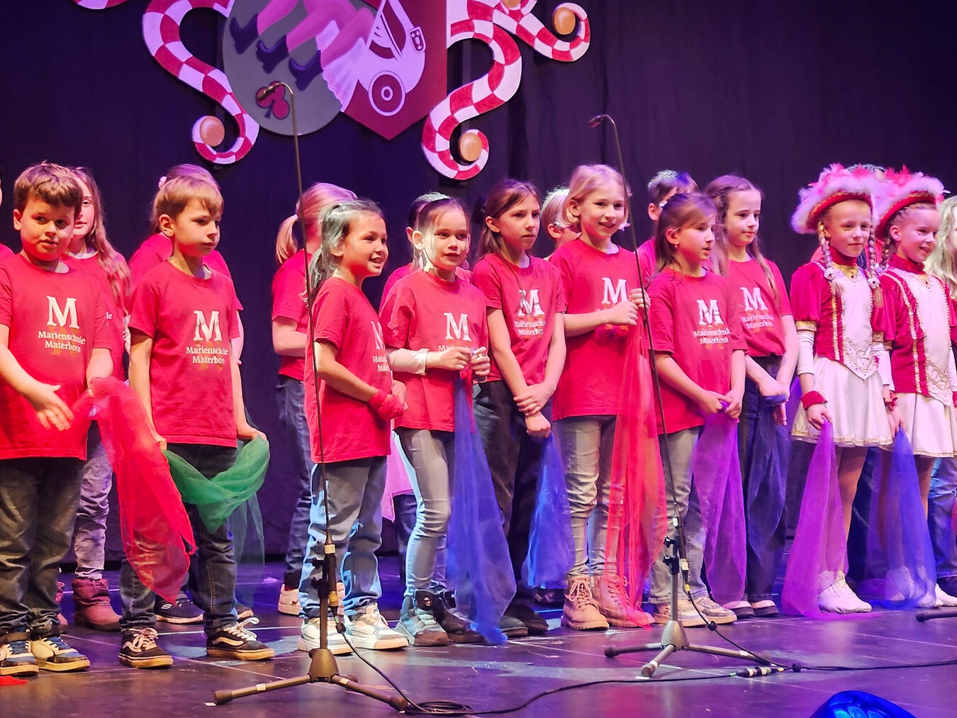 Los geht es nach dem Einzug des Elferrats erstmal mit einer ganzer Horde von Schwänen. Die entpuppen sich als letztjährige Fußgruppe. „Die Kostüme sind einfach so schön, die wollten wir euch nochmal zeigen“, wird erklärt. Die voll besetzte Stadthalle singt beim Funker-Lied mit – und die Funker-Familie strahlt. Im 101. Jahr übernimmt Jan Vierboom den Posten des Sitzungspräsidenten. Nach eigenem Bekunden ist er „knatznervös“, meistert seine Premiere aber souverän. Für den musikalischen Auftakt sorgen die Kinder der Mundart-AG der Materborner Marienschule. Mit „Kleef blivt Kleef“ und weiteren Klever Liedern singen sie sich direkt in die Herzen des Publikums – natürlich mit „guter Laune“, oben, unten, vorne, hinten und auch rechts und links.