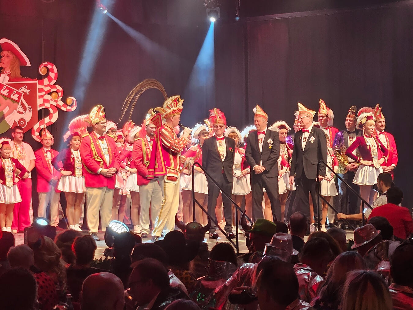 Dann heißt es auch schon: Bühne frei für Prinz Tobi den Träumenden. Das Klever Narrenoberhaupt nimmt Kurs auf die Stadthalle – für ihn ein echtes Heimspiel. Entsprechend groß ist der Jubel. „Ich bin zu Hause“, ruft er bewegt und muss ein paar Tränen verdrücken. Auf der Funker-Bühne machte er einst seine ersten Schritte im Karneval. „Ich sehe hier viele bekannte Gesichter“, sagt Tobi sichtlich gerührt. Die Garde präsentiert Prinzenlied und Männer-Mädels-Tanz, Orden gehen an Walter Heicks, Bernd Thiele und Peter Baumgarten, der in diesem Jahr seine 25-jährige Mitgliedschaft bei den Schwanenfunkern feiert – und auch an seine Oma, die heute im Publikum sitzt.