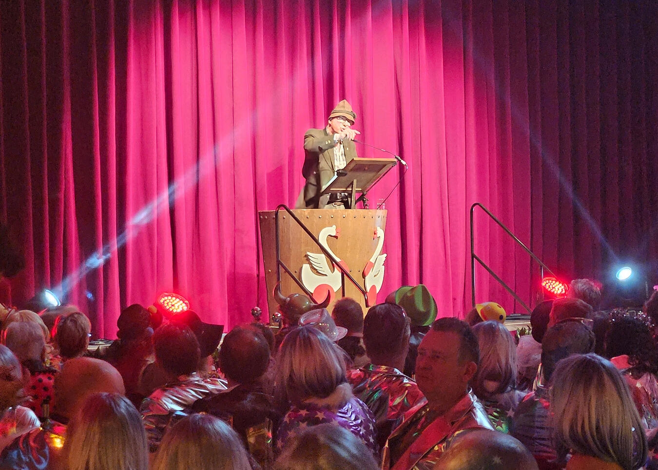 Ein besonderes Debüt gibt Ex-Bürgermeister Theo Brauer, der bei den Schwanenfunkern zum Schwanenritter geschlagen wird. In einem musikalischen Loblied würdigt er den Verein als „ein Stück Klever Seele, Heimat und Herz“. Mit weise gewählten Worten bricht er eine Lanze für eine Prinzessin oder ein Prinzenpaar im Klever Karneval. „Sie funkeln, sind klug und so charmant – und doch kein Krönchen weit und breit erkannt“, stellt er fest und fordert, vom Publikum bejubelt: „Gebt endlich Kleve, was Kleve verdient.“ Der anschließende Ritterschlag ist mehr als verdient.