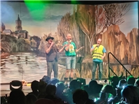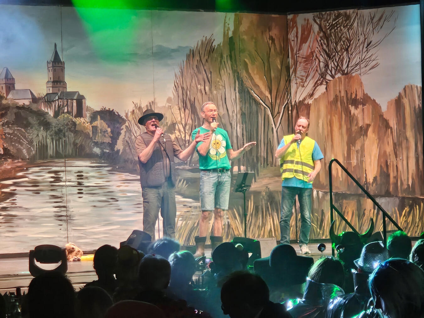 Eine Zeitreise gibt’s bei Fred Krusch, Jan Meyer und Paul Heinz-Böhmer, die, bestens versorgt von Wirtin Rosemarie „Rosi“ Schulz, beim Bühnenstück „Bej Rosi“ in Erinnerungen schwelgen und dabei nicht nur von legendären Kneipen schwärmen ( („gib‘ et nich‘ mehr“), sondern auch Ex-Volksbank-Chef und Ex-Bürgermeister anführen. An legendäre TV-Zeiten erinnern die Chaoten, bei denen der Name Programm ist. Sie holen Thomas Gottschalk und „Wetten, dass..?“ auf die Stadthallen-Bühne und wetten, dass das Publikum mehr Stimmung macht als der feiererprobte Elferrat – eine Wette, die mühelos (und „schwer unfair“) aufgeht.