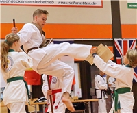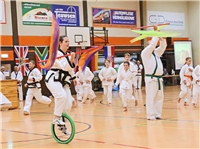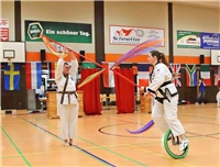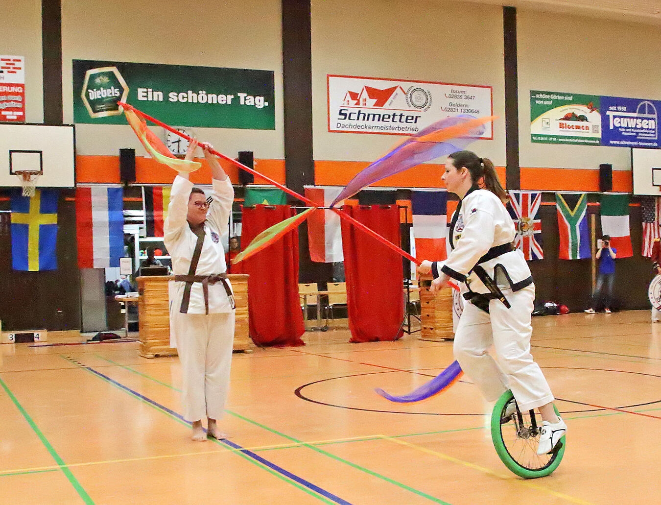 Der eigentliche Wettkampf begann unter anderem mit der beliebten Disziplin „Kreativität“, bei der traditionelle Tang Soo Do-Techniken mit Musik, Tanz und Erzählungen kombiniert werden. Alle angetretenen Teams begeisterten mit packenden Darbietungen, die das Publikum zum Staunen brachten. Die Gruppe aus 25 Teilnehmenden des Tang Soo Do Issum – darunter Kinder, Jugendliche und Erwachsene – trat an mit einer Art Zirkusdarbietung angelehnt an den Film „The Greatest Showman“, inklusive Akrobatik, Showkampf und Einrad-Einlage. Mit ihrer mitreißenden Show sicherte sich das Issumer Team den ersten Platz in der Kategorie Kreativität. Abteilungsleiter und Tang Soo Do-Meister Achim Brall, der den Wettbewerbsbeitrag im Zirkusdirektor-Kostüm einleiten durfte, zeigte sich sichtlich stolz auf seine Zirkustruppe.