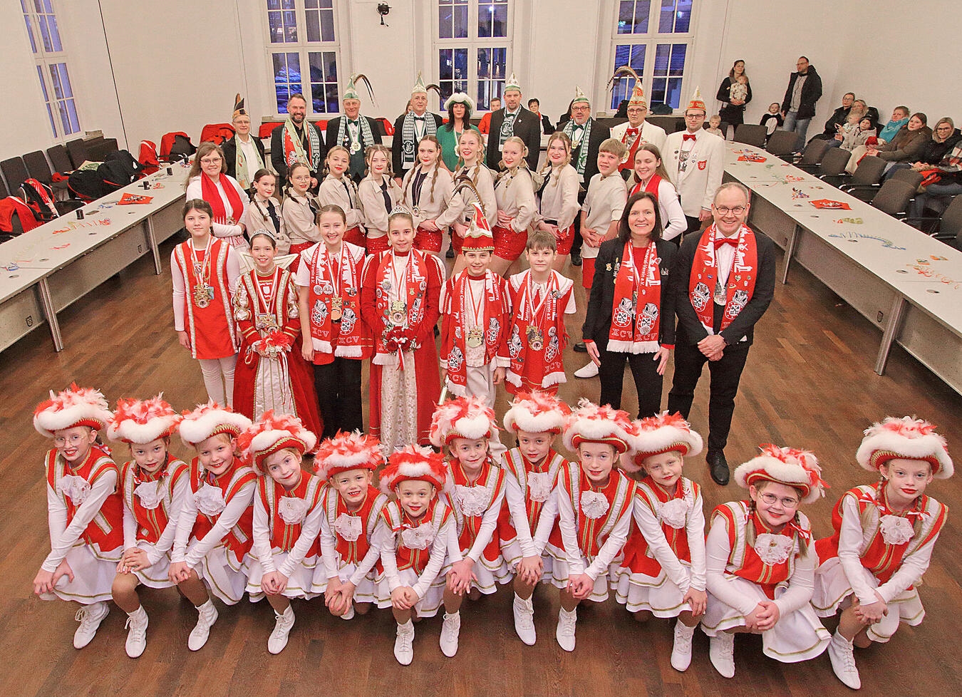Da war was los im Ratssaal: Bürgermeister Rafael Zur (hintere Reihe, 2.v.l.) hieß das neue Kinderprinzenpaar Kiara I. und Felix I. (zweite Reihe, Mitte) und Prinzessin Lara (zweite Reihe, 2.v.l.) willkommen und wünschte ihnen eine tolle Session. NN-Foto: Theo Leie