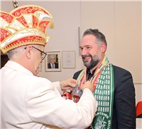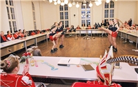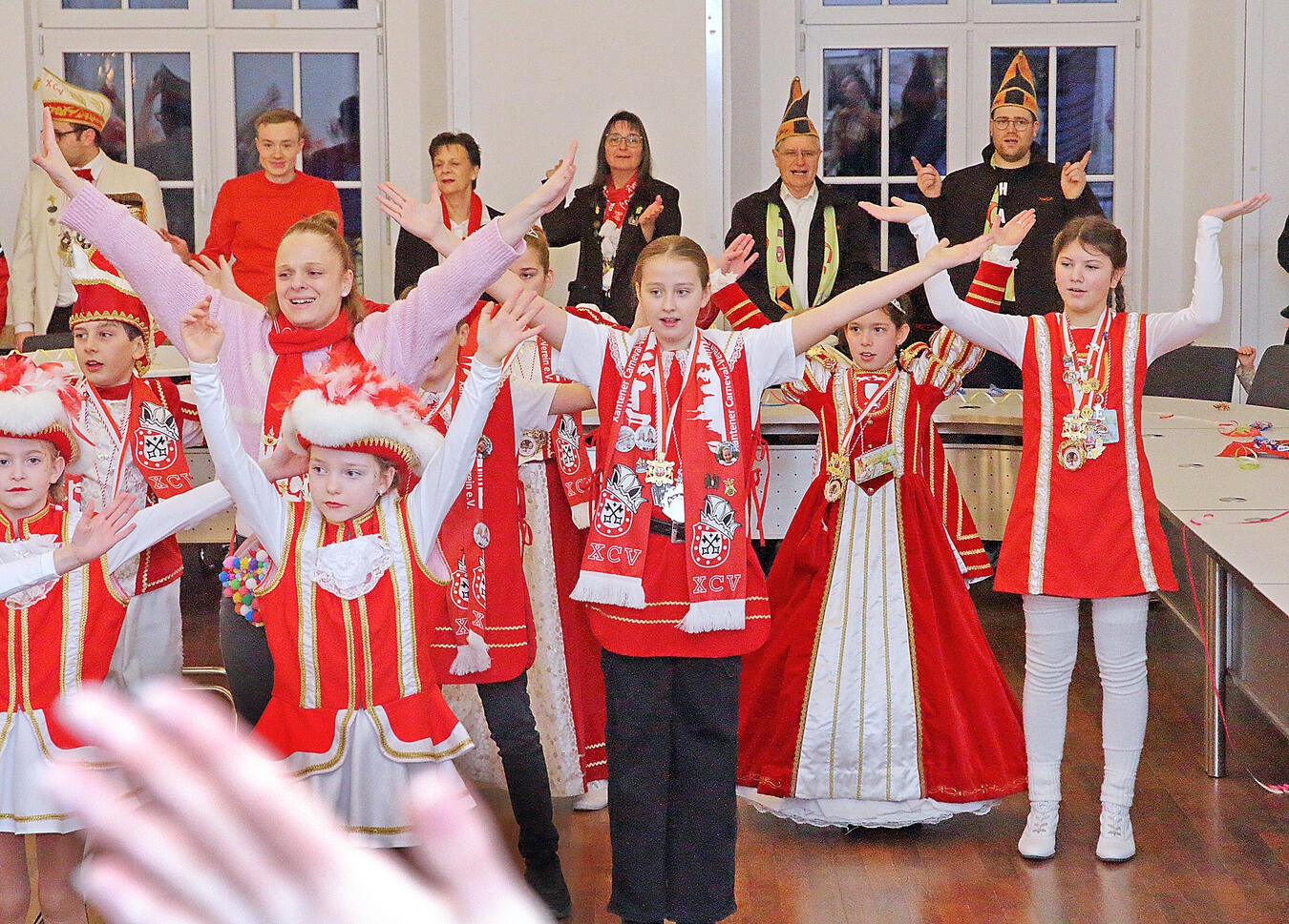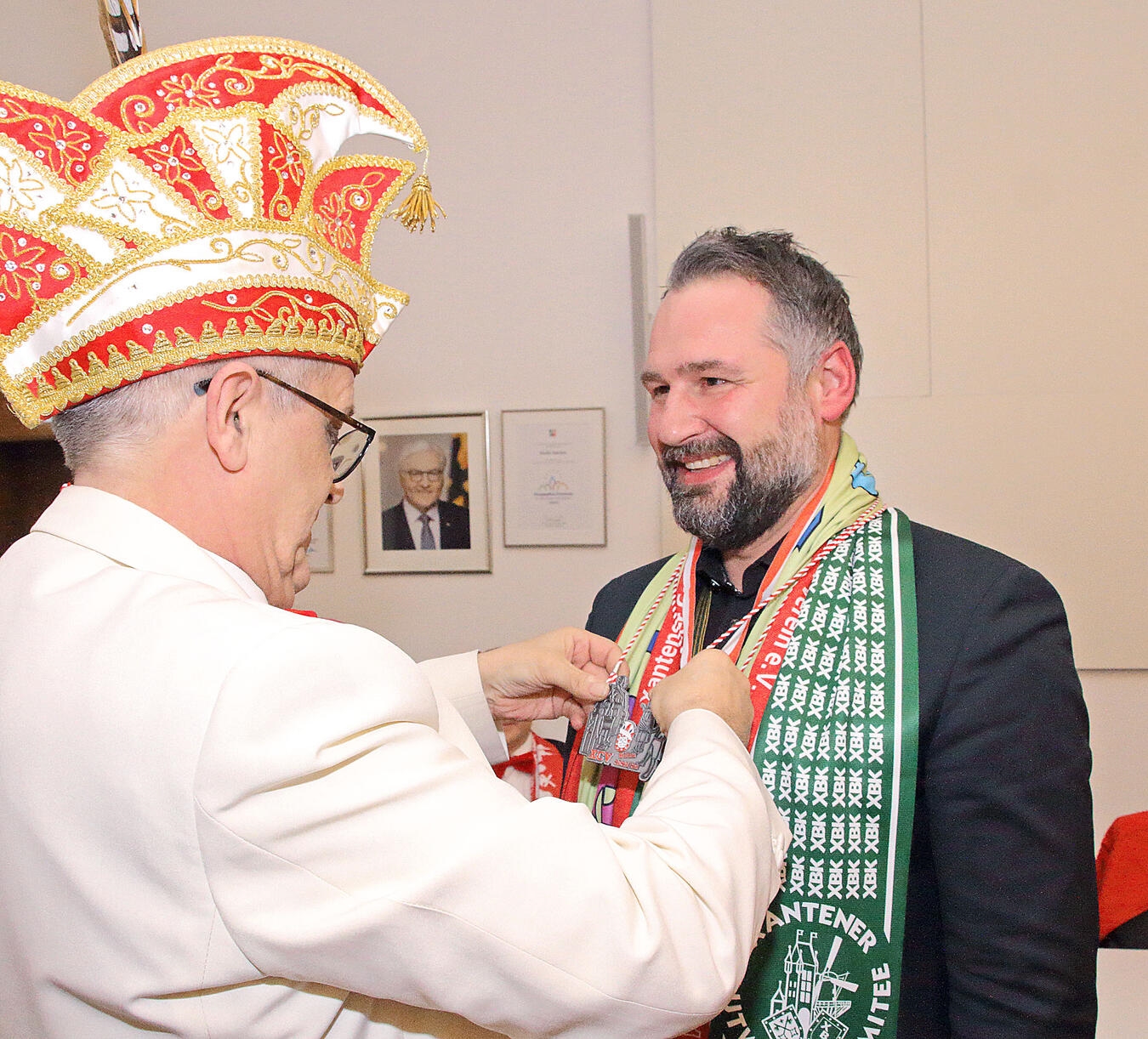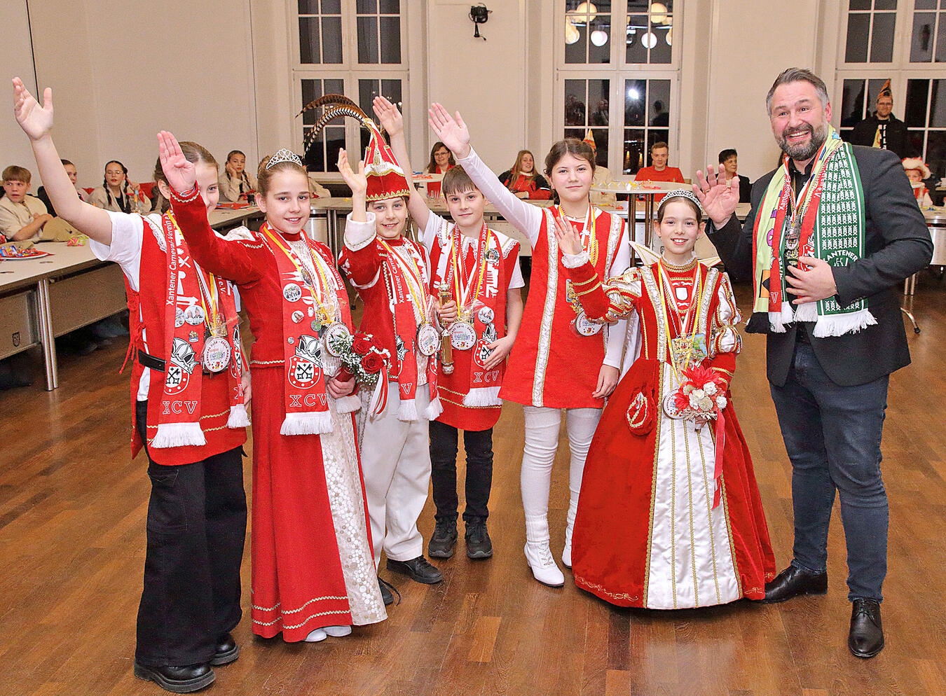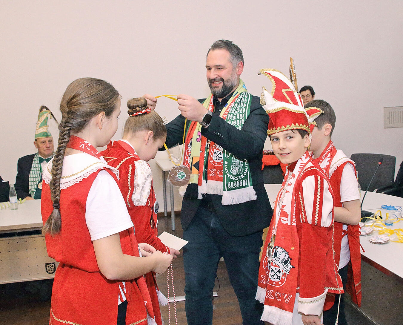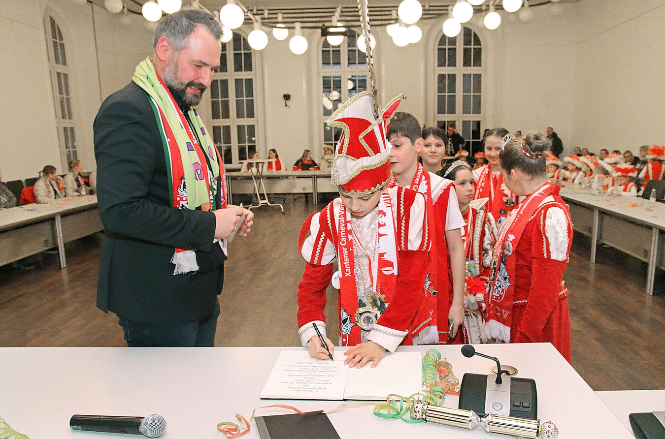 Unterstützt werden Kiara und Felix in dieser Session von ihren Pagen Max (Böddecker) und Maria (Karsten). Unter dem Motto „Es lacht das Herz, es tobt der Saal, das ist der XCV-ler Karneval“ zieht das fröhliche Viergestirn, begleitet von rund 50 Tänzerinnen aus Kindergarde, Showtanzfunken und XCV-Tanzgarde, in diesen Tagen durch die Sitzungssäle und sorgt überall für beste Stimmung. „Wir feiern Karneval mit Herz und Mut“, richtet Felix I. das Wort an das Narrenvolk, „denn Spaß mit euch – der tut uns gut.“ Der Prinz ist zehn Jahre alt, besucht das Stiftsgymnasium in Xanten, liebt die Leichtathletik, spielt am liebsten draußen mit seinen Freunden und greift auch mal gern zum Buch. Prinzessin Kiara ist elf Jahre jung, geht zur Marienschule in Xanten, kickt beim SSV Lüttingen den Ball und spielt Saxophon. Beide kommen aus Lüttingen. Im vergangenen Jahr haben sie – ganz nach Xantener Tradition – bereits als Pagen Karnevalsluft geschnuppert, um nun endlich selbst ganz vorne im Rampenlicht zu stehen. „Für uns war sofort klar, dass wir auch die Krone wollen“, sagt Kiara lachend, die mit Felix befreundet ist. Sie freue sich „auf viele schöne Momente“. Und allein schon „wegen der guten Aussicht“ vom Wagen des Kinderprinzenpaares beim Blutwurstsonntagszug schlüpft auch Felix nur allzu gern ins prächtige Kostüm. Als Bürgermeister Zur schließlich zum Eintrag ins Goldene Buch der Stadt Xanten bittet, zögert Felix keine Sekunde, greift beherzt als Erster zum Stift und nimmt anschließend stolz Bürgermeisterorden und den obligatorischen „Umschlag“ entgegen. Es wird gedankt, gestrahlt und kräftig applaudiert – von den Abordnungen des Xantener Blutwurstkomitees (XBK), von Halt Pölje und natürlich vom XCV. Für Bürgermeister Zur und Vorstandssekretärin Gaby Janßen, die den Rathaus-Empfang Jahr für Jahr organisiert, gibt es die Orden des Kinderprinzenpaares – und dann ist der offizielle Teil auch schon vorbei.