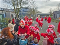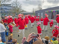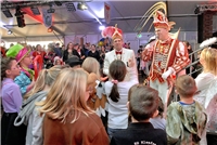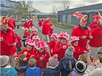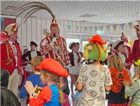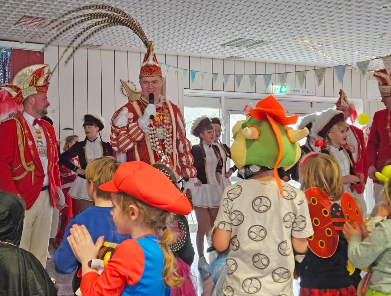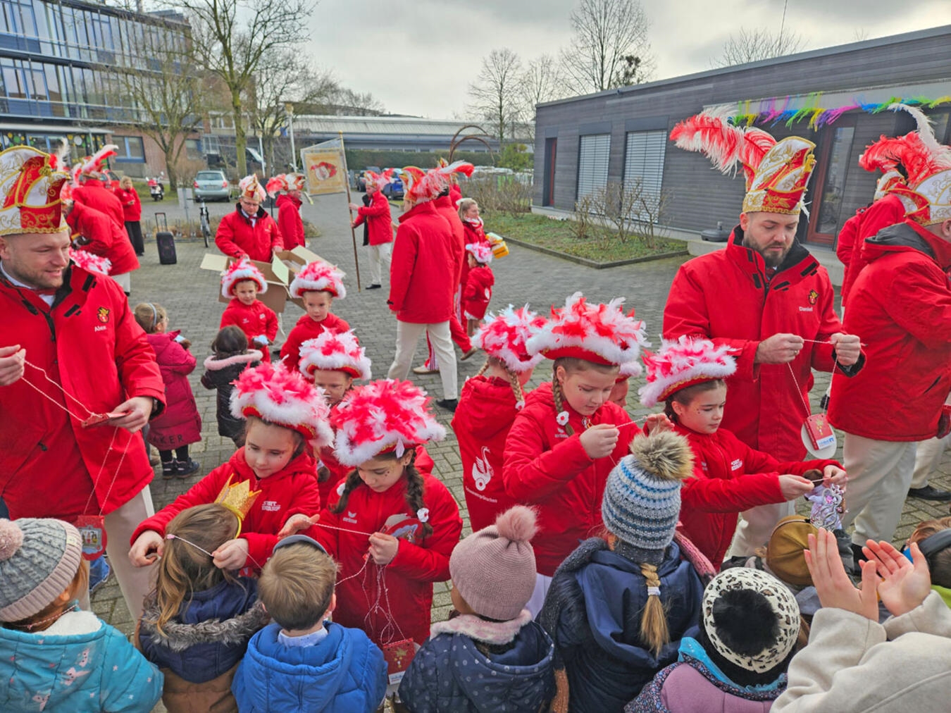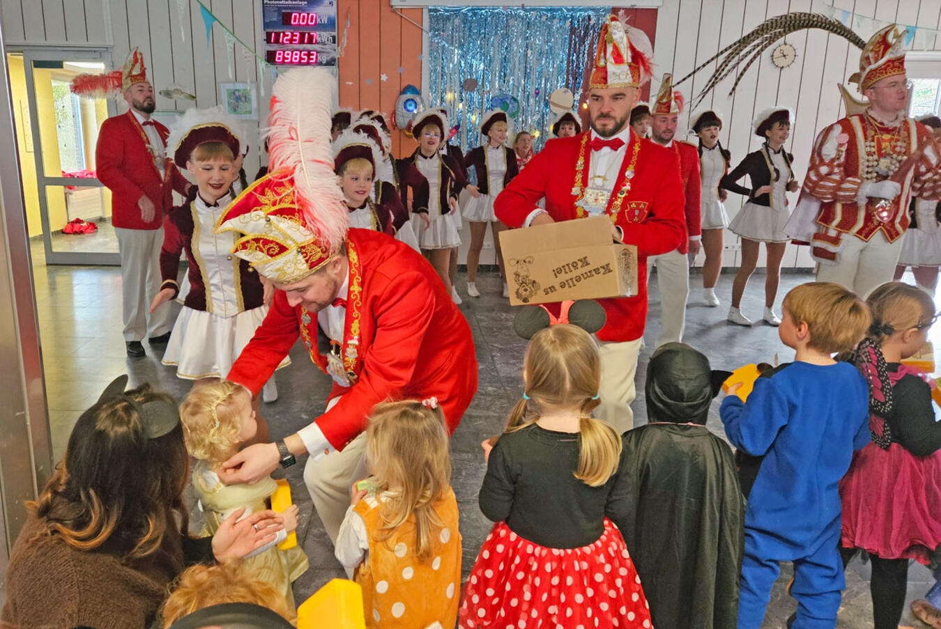 Montagmorgen, 10 Uhr: Busfahrer Jürgen sitzt im Warmen, während die Garde schon den zweiten Kindergarten besucht. Adju Simon bringt noch eben das prinzliche Schuhwerk auf Hochglanz, Adju Tim kündigt derweil in der nächsten Kita das baldige Eintreffen an. Kurz durchzählen, ob ausreichend Brotdosen, Teddybären und mit Süßigkeiten gefüllte „Orden“ dabei sind. Die Musik ist noch leise, man läuft langsam warm. „Wir sind schon seit 8 Uhr unterwegs“, sagt Tobi, der heute noch vielen Elsas und Superhelden begegnen wird. Er braucht aber erstmal Zucker. Ein Choco fresh später sieht die Welt schon anders aus. „Ich finde toll, was ihr hier für die Kinder auf die Beine stellt“, bedankt er sich beim Kita-Team in Schneppenbaum für den herzlichen Empfang und lädt zur Polonäse ein. Worüber er sich besonders freut: „Meine kleine Schwester Charlotte ist heute mit dabei!“ Montagmorgen, Schule? Brauchtumspflege ist das Zauberwort – und Karneval schließlich nur einmal im Jahr. Bei Bedarf vom Unterricht befreit sind auch die Tanzmädchen, im Wechsel die Funkerschwänchen und die Schwanenfünkchen. Komplett wird die Meute mit den Prinzenliedsängern Jakob und Larissa, dem Media-Team David und Björn und den Gardefrauen, die natürlich nicht nur für die Wahl der Prinzen-Schlückchen verantwortlich zeichnen.