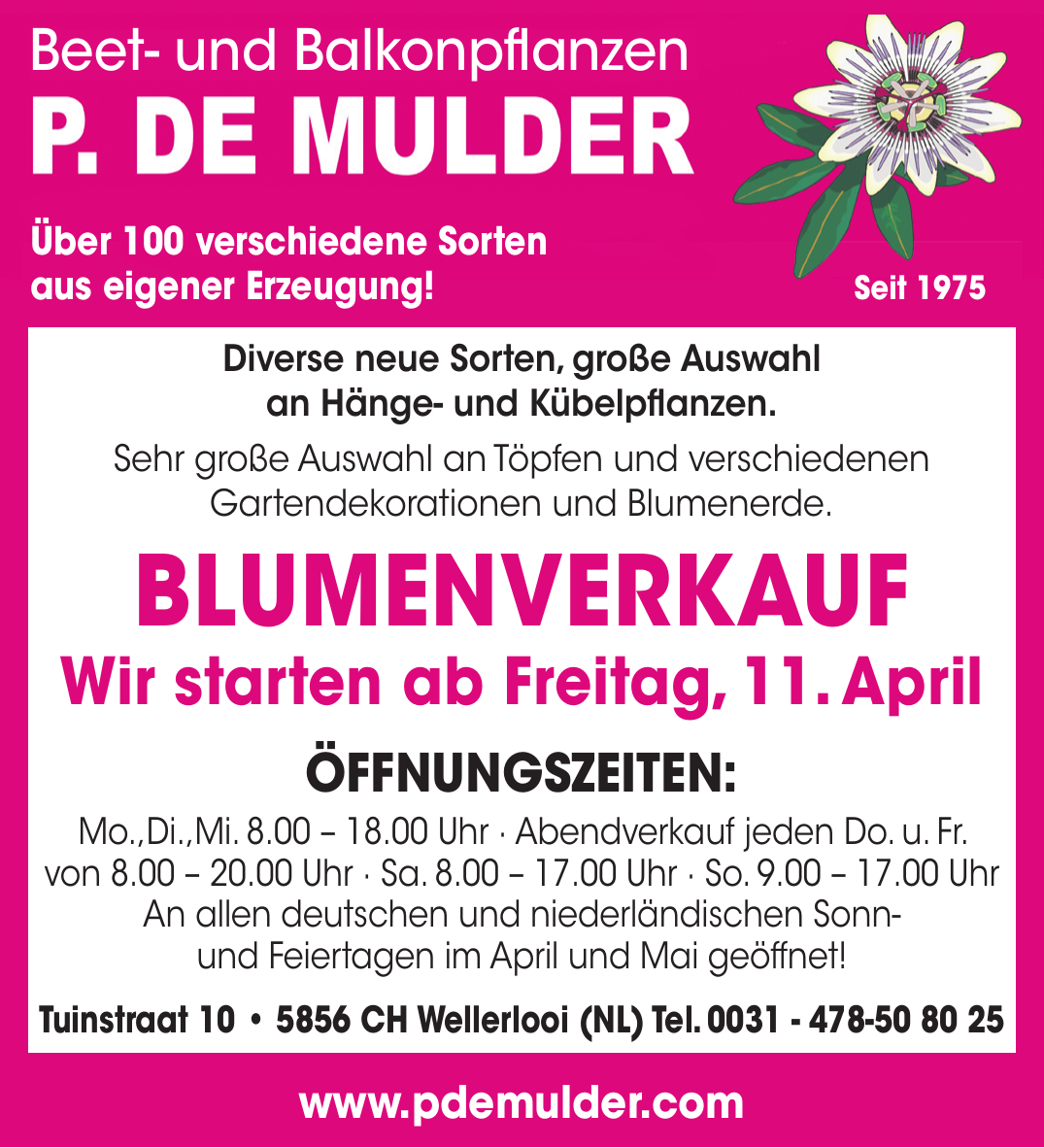 Die Perkplantenkwekerij P. de Mulder bietet eine große Auswahl an über 100 Arten von Blumen und Pflanzen aus eigener Zucht, einschließlich hängender Pflanzen und Kübelpflanzen sowie qualitativ hochwertige Blumenerde und Dekoartikel.